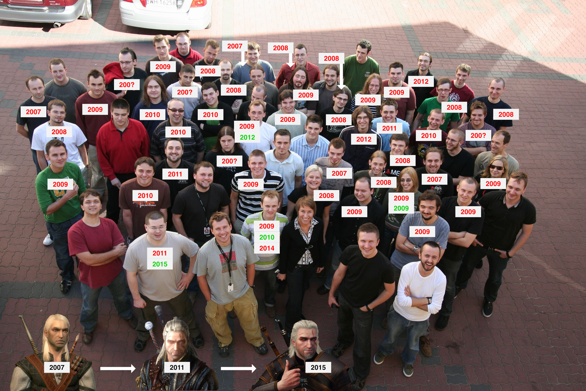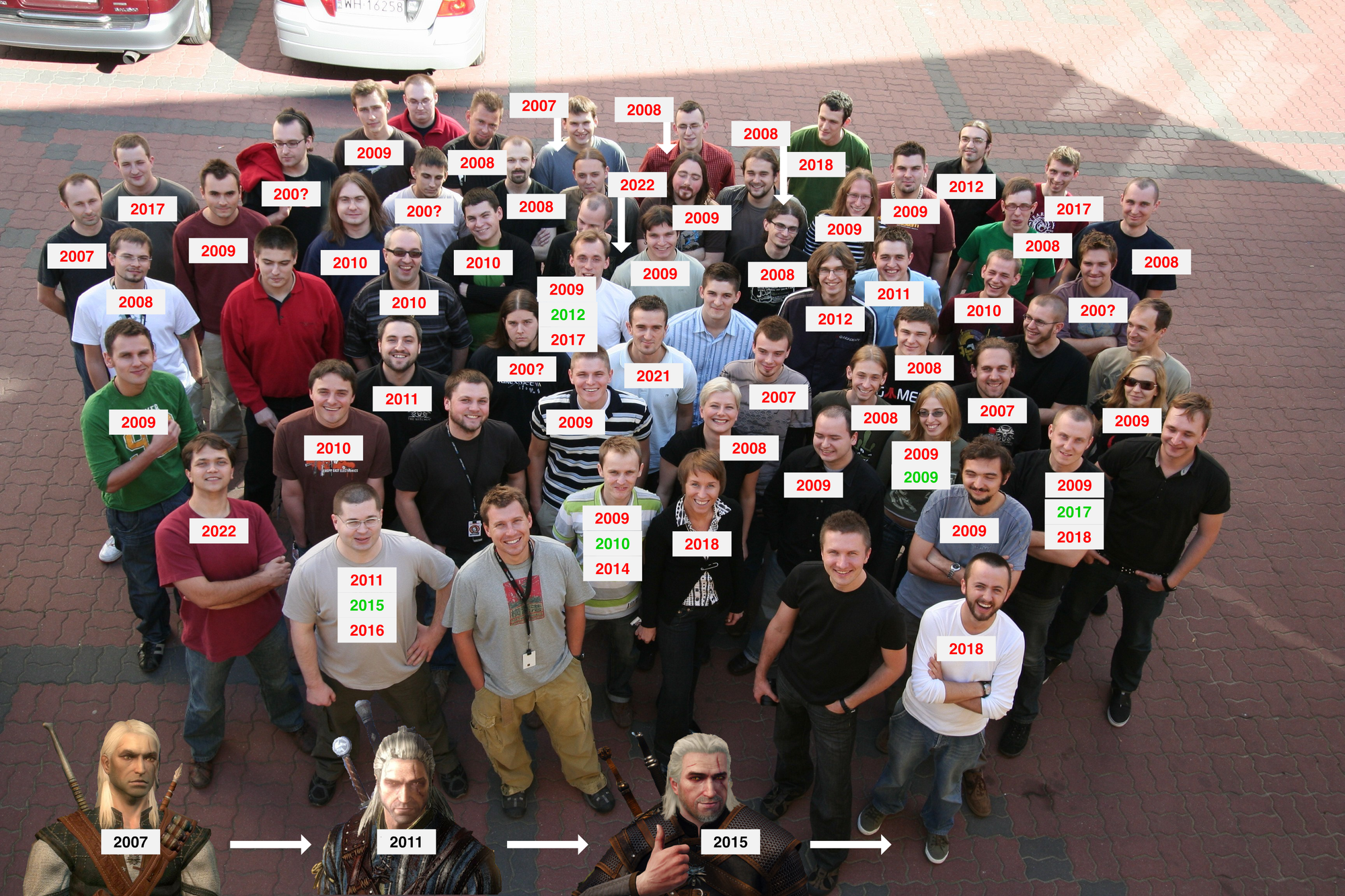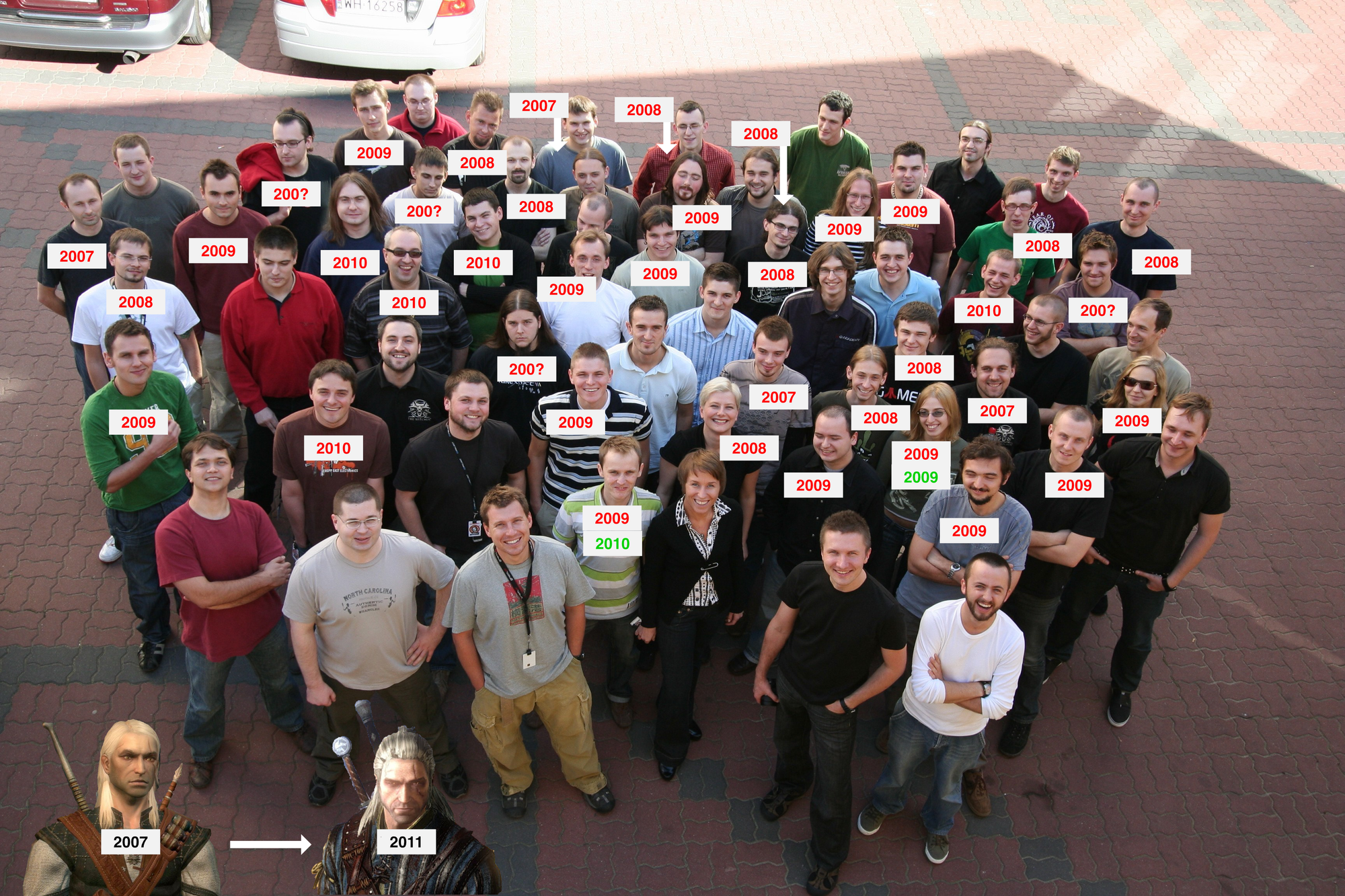 The post from 2010 is a picture of the team that made the game, published (if my memory serves) in the official artbook. In the picture, people who no longer worked at CDPR were marked with red Xs. The title said: The Witcher Team – 3 years later.